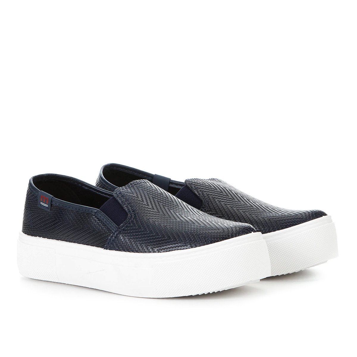 Sapatilhas slip-on azul escuro com sola branca e padrão em espinha de peixe. Tênis Mocassim Moleca azul escuro com textura chevron e solado branco Ténis de senhora preto com textura e sola branca Sola branca antiderrapante de ténis com padrões ondulados e texto em relevo