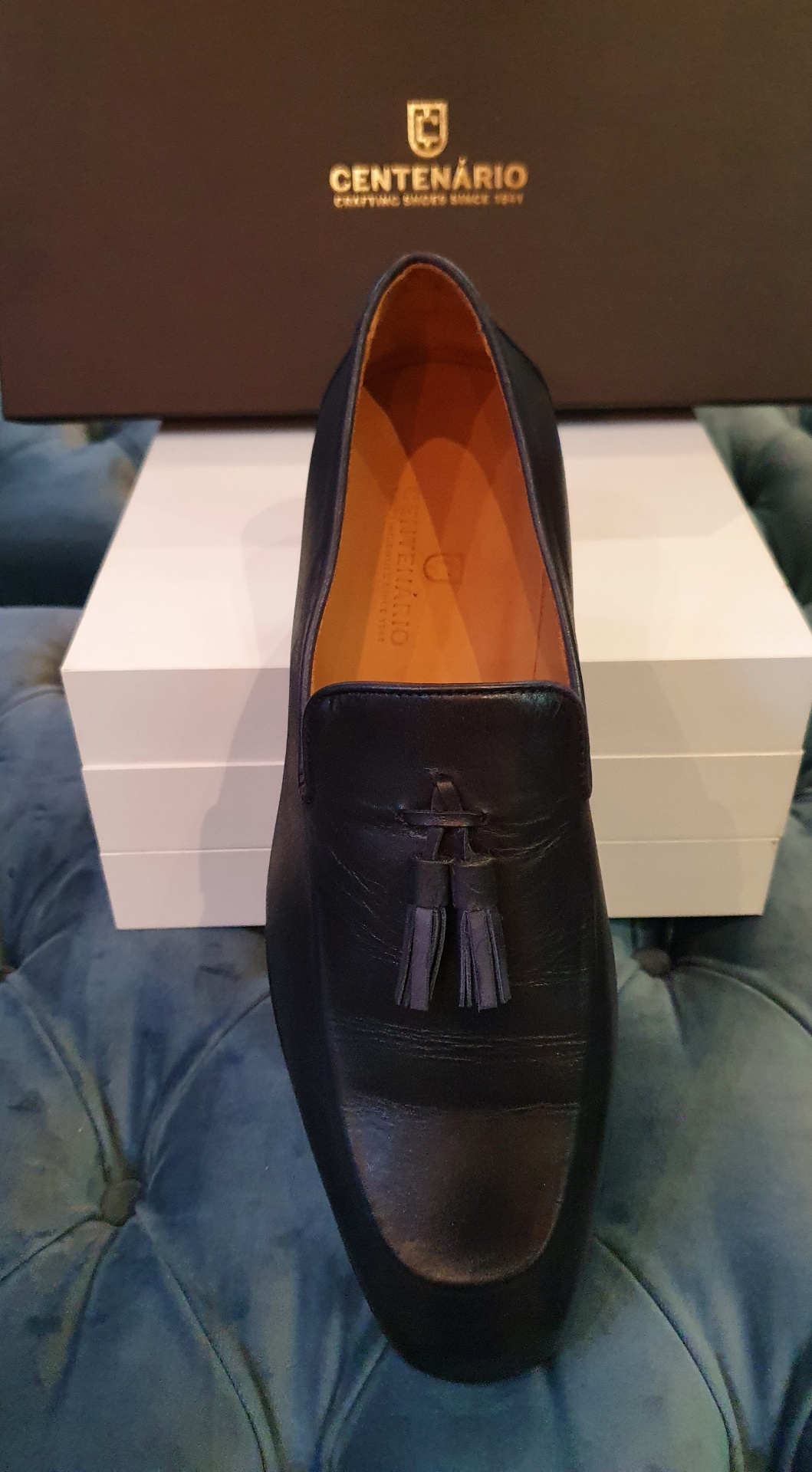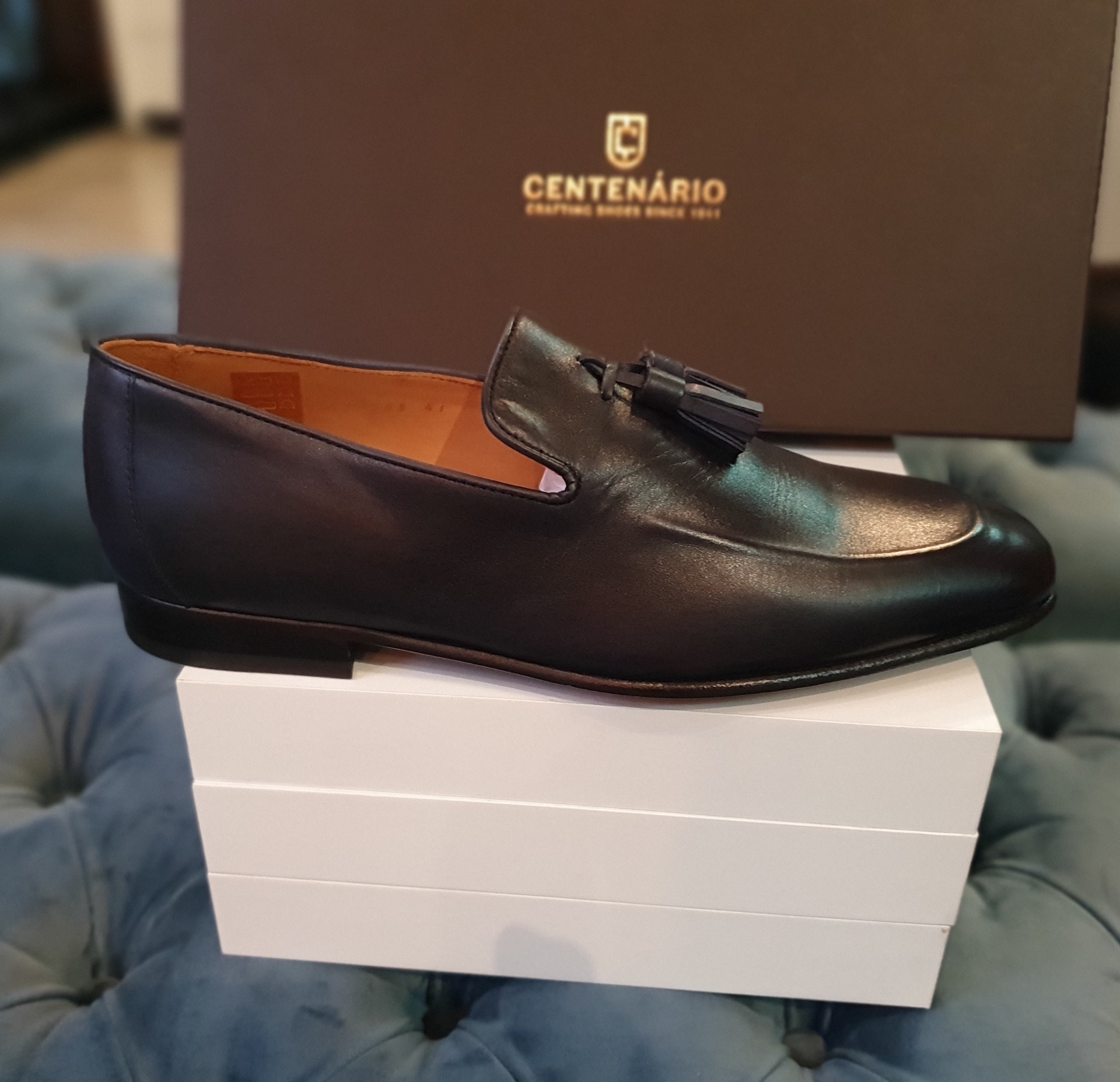 Este Tassel Loafer da Centenário, excelente para usar com fatos de tweed, com sola em pele e borlas para enfeite da parte frontal.